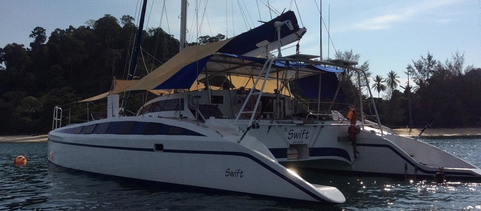 Swift is a 47' sailing catamaran, strongly constructed for racing in the frequently stormy waters off the Brittany coast. She now enjoy's a somewhat more relaxed role after being re-fitted for use as a charter vessel by her present owner.
