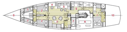 1 - Master cabin 2 - Guest cabins 3 - Living room 4 - Chart table 5 - Dining table 6 - Galley 7 - Crew quarter 8 - Engine room 9 - Chain room 10 - Technical room